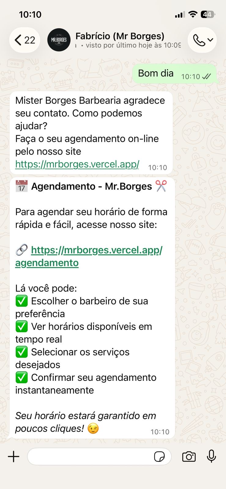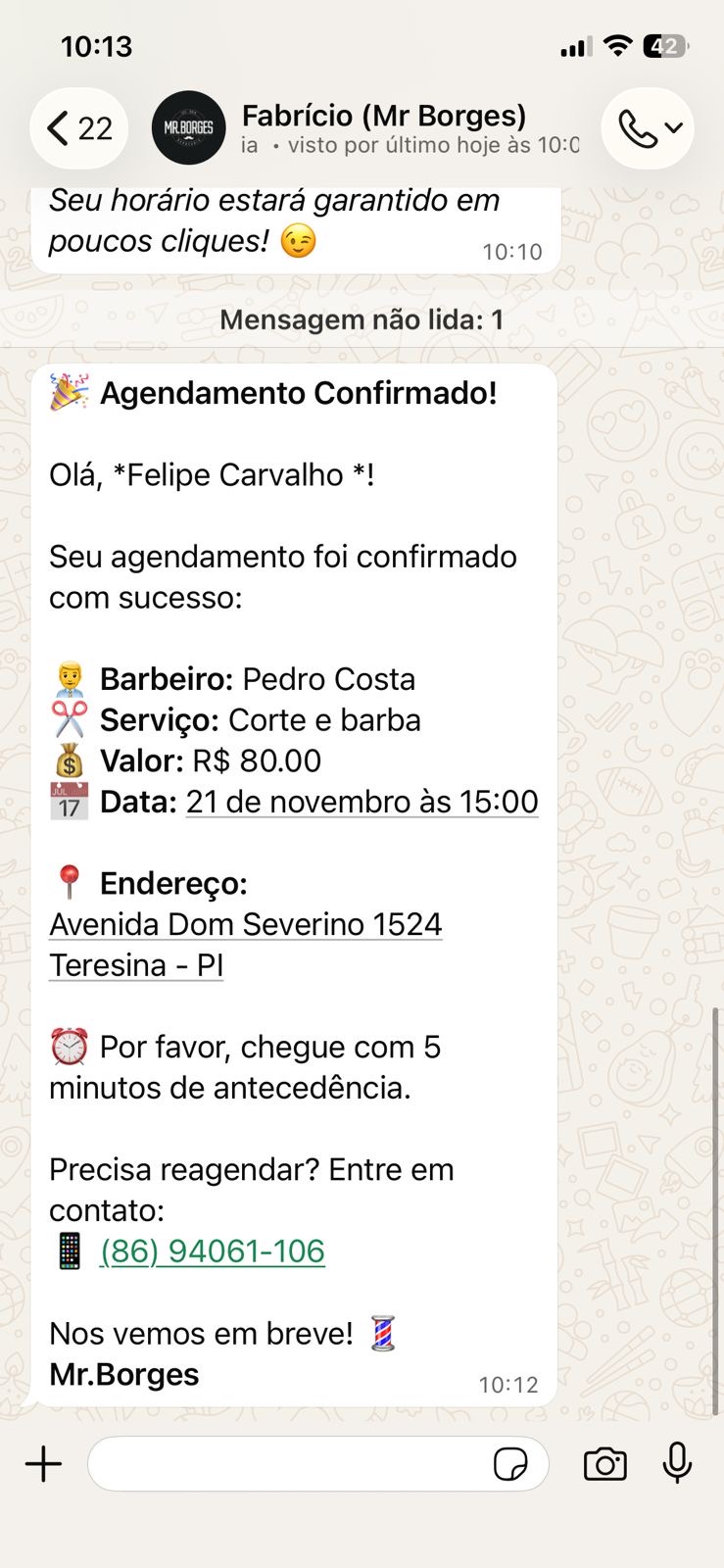 Sistema inteligente de notificações que envia mensagens detalhadas via WhatsApp com todas as informações do agendamento: barbeiro, serviço, valor, data, horário, endereço e até lembrete de pontualidade.