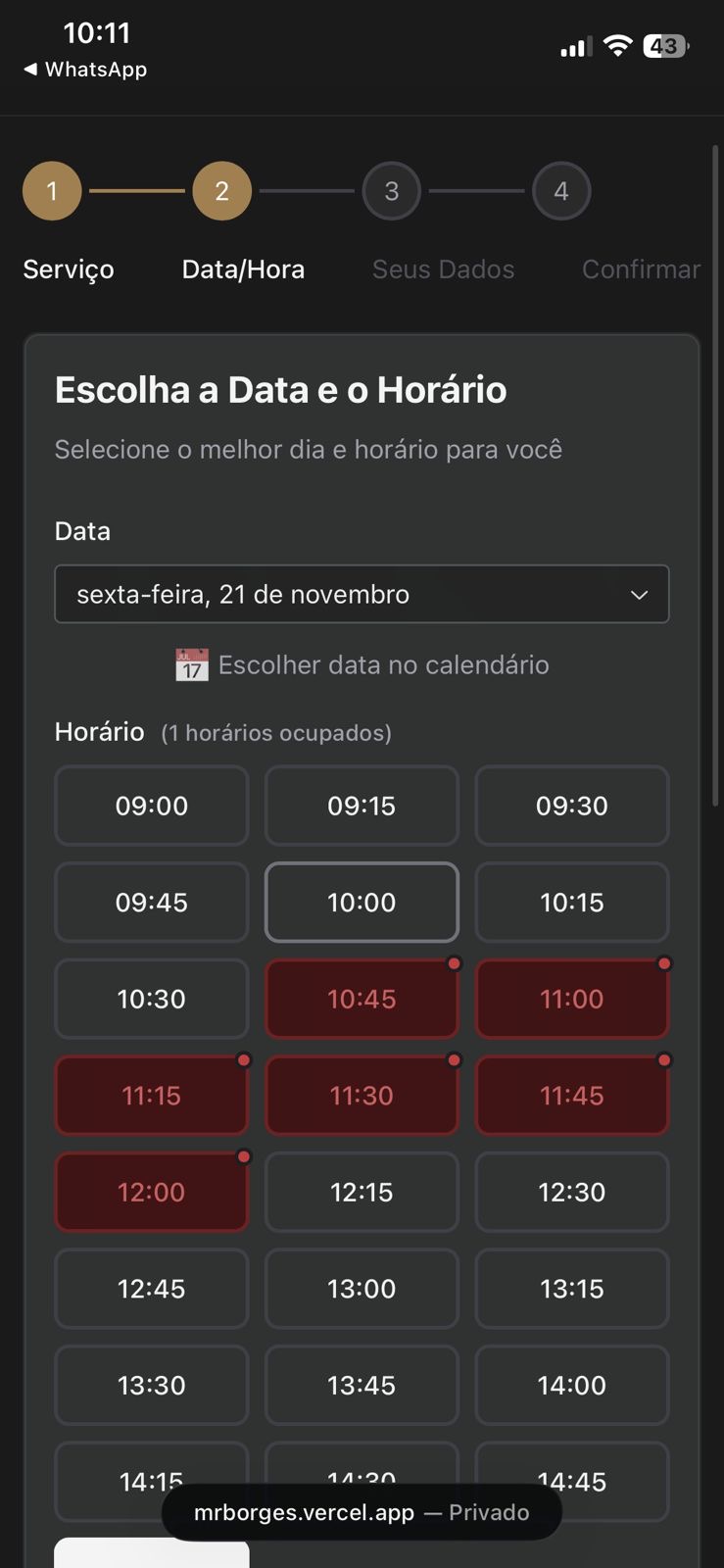 Cada barbearia recebe uma landing page personalizada e responsiva. Hero section com destaque para experiência, botões de agendamento e contato direto via WhatsApp. Métricas de credibilidade e avaliações.