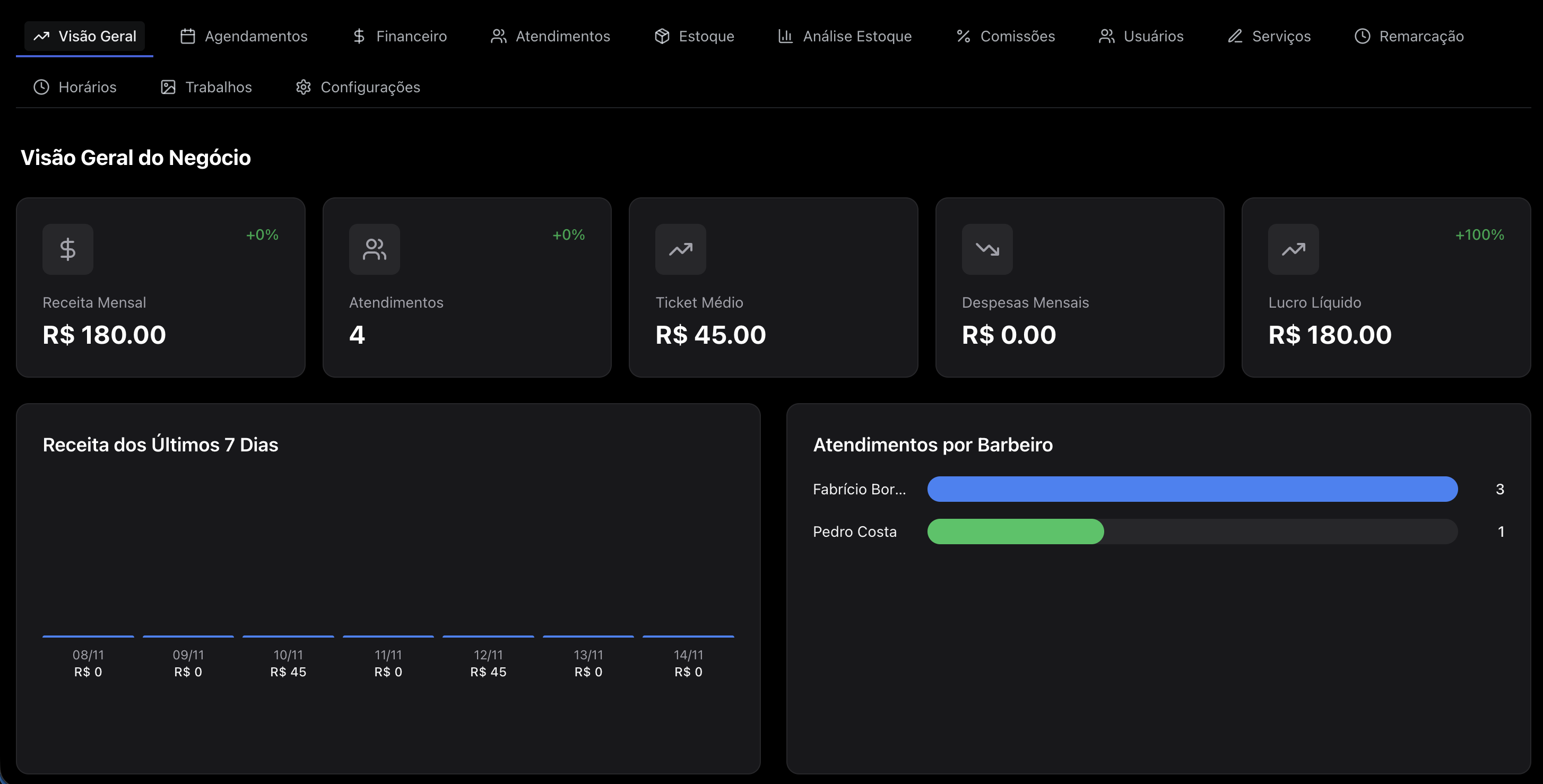 Conheça cada funcionalidade do Barber Club através de capturas reais do sistema